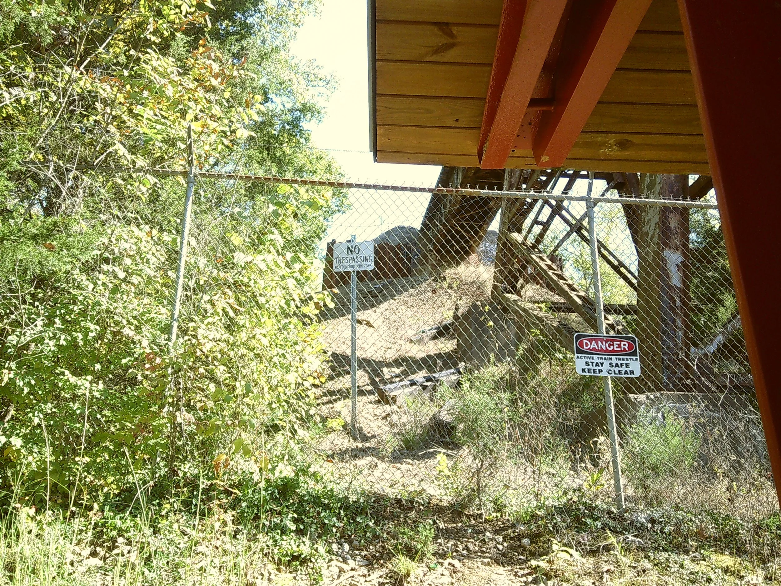 The fence and signs under the Pope Lick Creek Train Bridge taken by Kay Cole